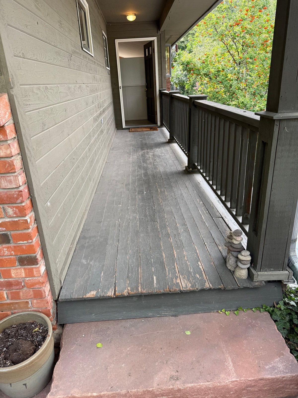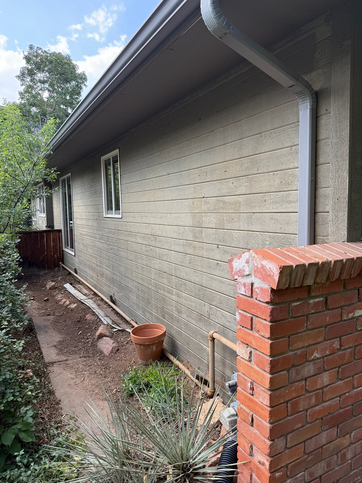 - Sprayed and back rolled solid stain on siding for deep, even coverage